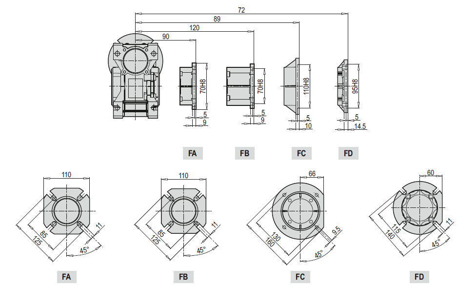 | 130 | 45h6 | 80 | 85 | 170 | 265 | 340 | M16 | 14 | 48.5 |